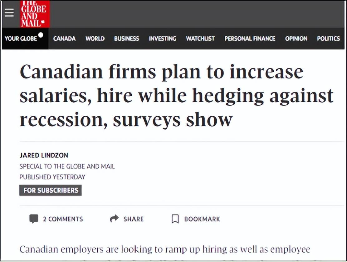 根据Globe and Mail网站的消息,据一项调查发现,加拿大有一半雇主在考虑将2023 年工人的工资平均增加 4.7%。还有一些雇主正考虑在一些至关重要的岗位上增加薪酬预算。